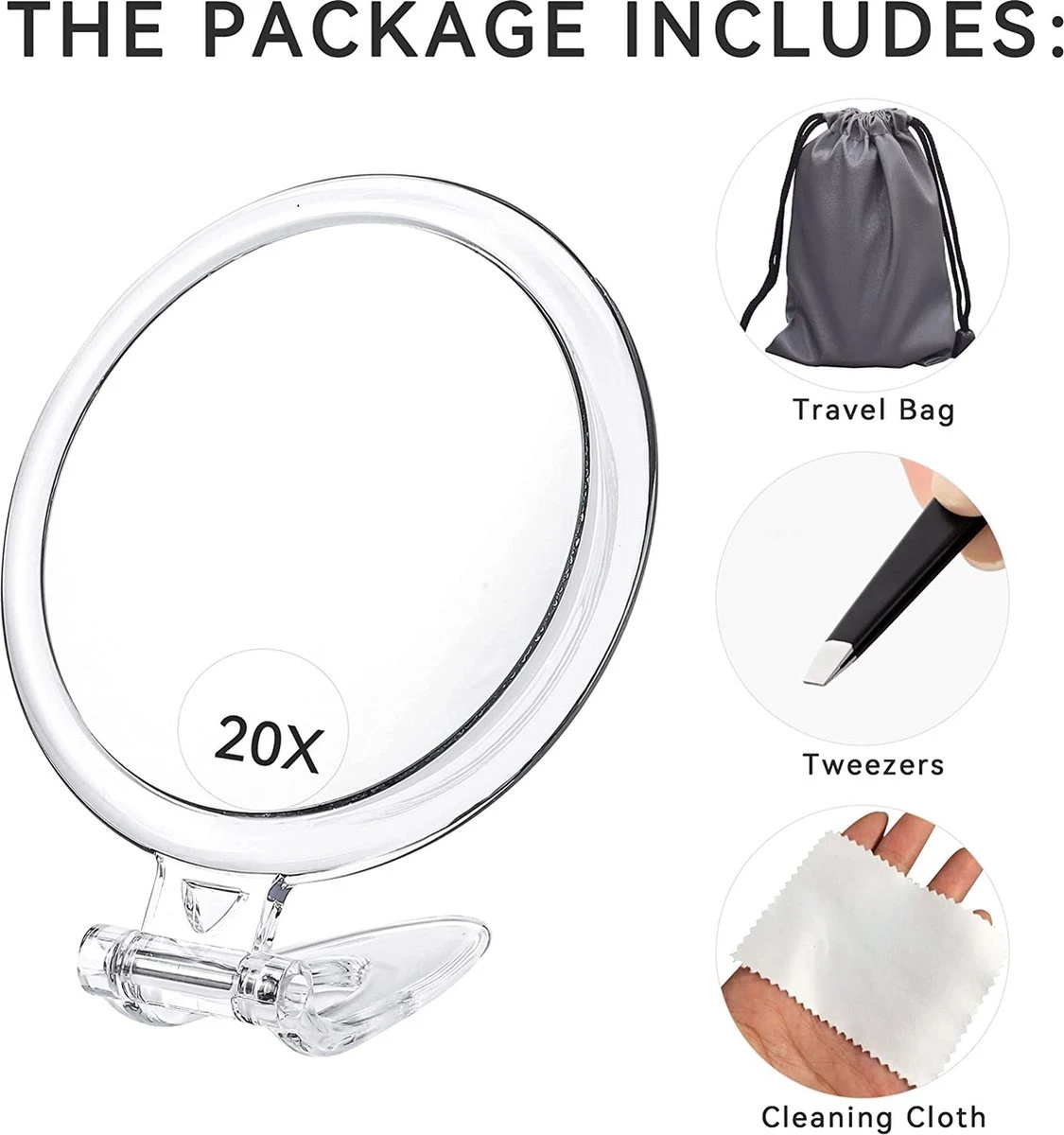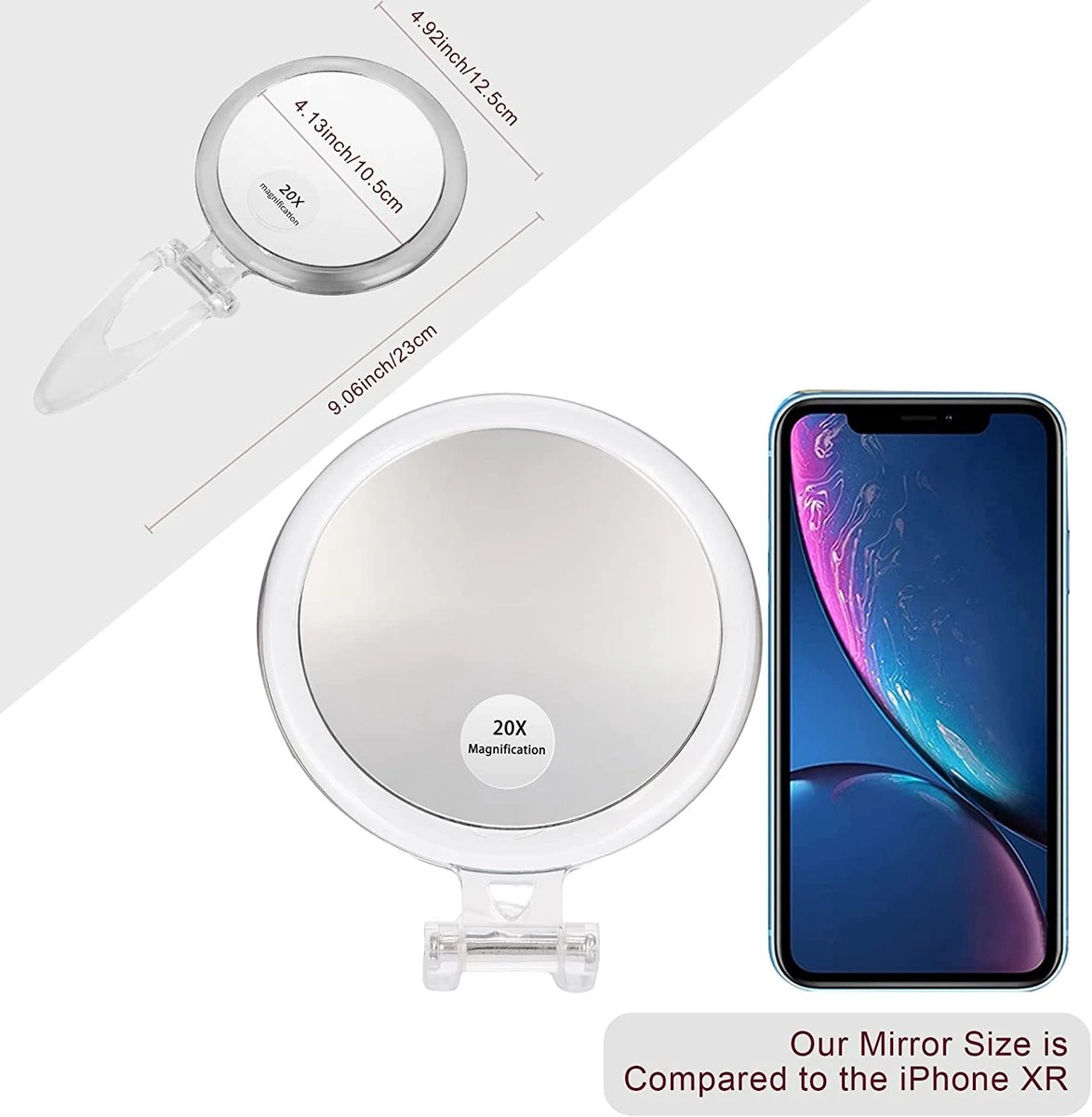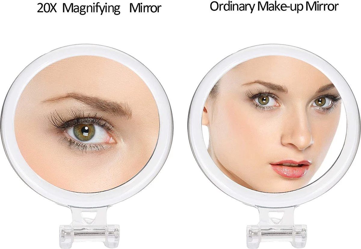 - Spiegel met 20x vergroting, gemaakt van optisch kwaliteitsglas; 5 inch rond. De meeste 20x vergrootspiegel is 4 inch groot, dit is de nieuwe maat, 5 inch groot.