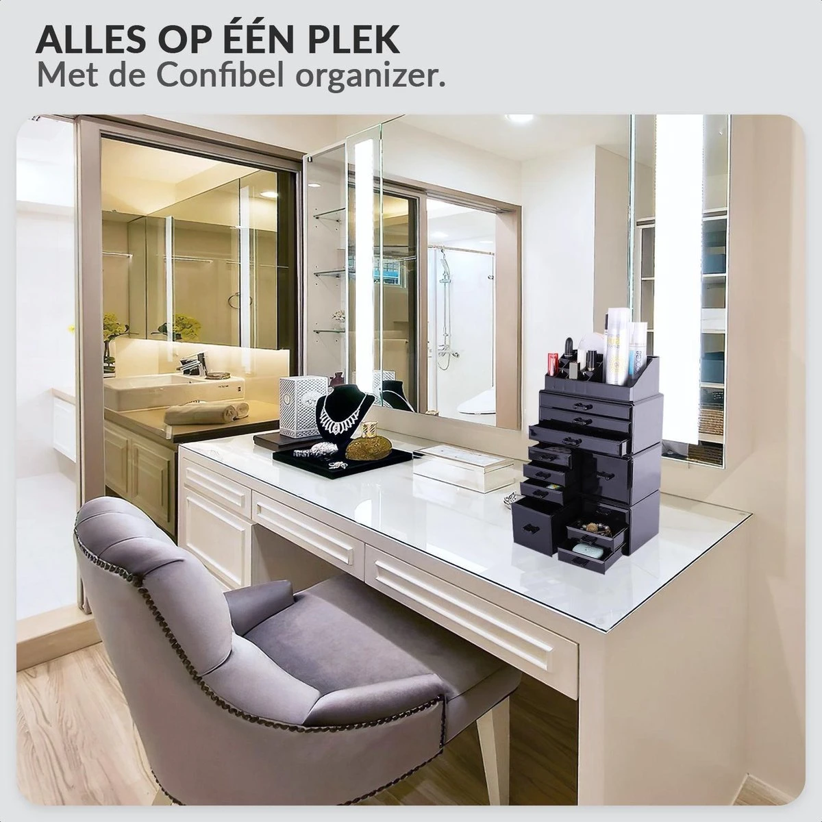 Wil je snel en op een georganiseerde manier al je make-up opruimen? Met de Make-up Organizer met Lagen is snel geregeld. Het heeft meerdere lades en vakken voor grotere dingen. Er zijn grote en kleine lades zodat verschillende groottes make-up erin passen. Door het ontwerp neemt het niet veel ruimte op je bureau, badkamer of kast en het ziet er mooi uit. Ook kun je zelf kiezen hoe de lades en vakken in de Organizer zitten en dus de meest comfortabele lay-out kiezen die je wilt.