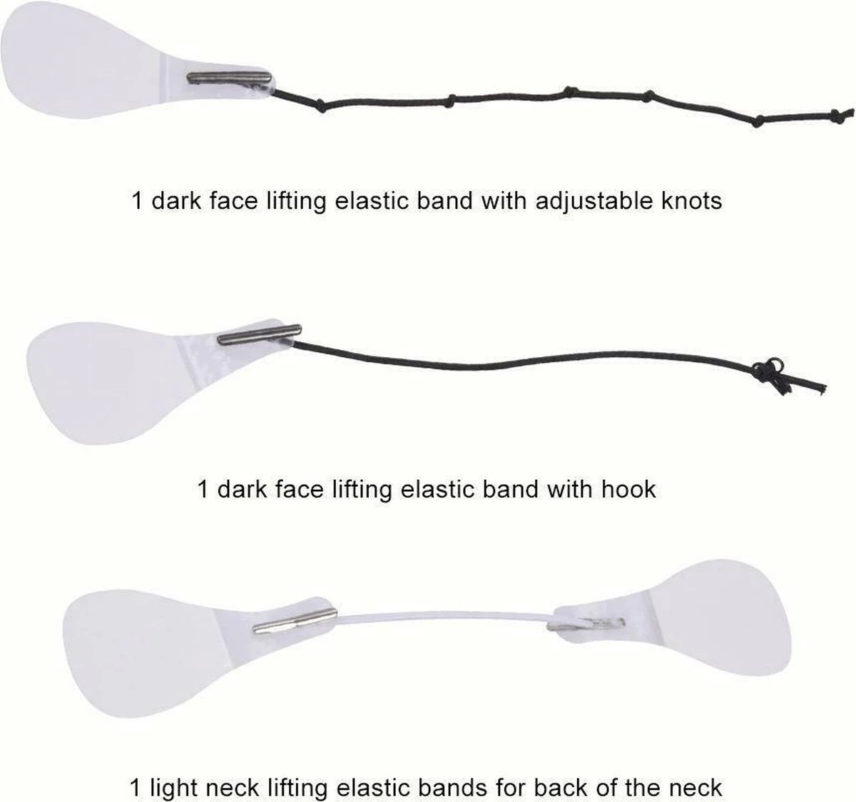 In deze verpakking vindt u 40 stuks facelift tape en 3 verschillende elastieken. Twee elastieken zijn ontworpen voor gebruik op het gezicht, terwijl het derde elastiek is bedoeld voor gebruik in de nek. De tape is geschikt voor gebruik op de meeste huidtypen en kan helpen bij het verminderen van zichtbare tekenen van veroudering.
