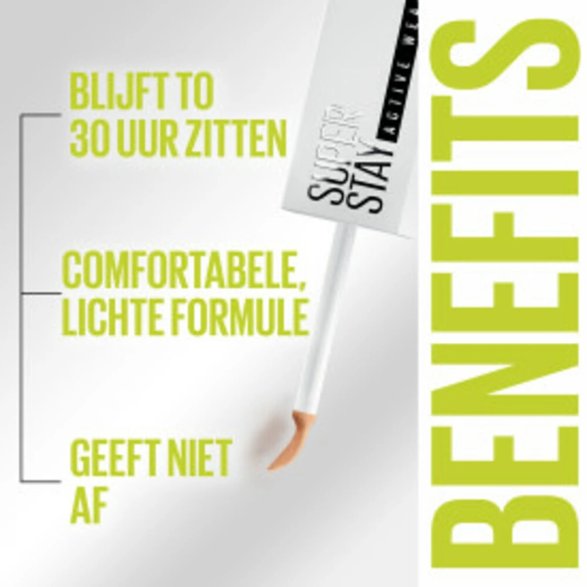 SuperStay Active Wear geeft je een volledige dekking met matte finish die tot 30 uur blijft zitten. De textuur is comfortabel, voelt licht aan en is gemakkelijk aan te brengen door de flexibele applicator. De Maybelline concealer vervaagt niet, gaat niet in de lijntjes van je gezicht zitten én is waterproof voor een flawless finish wat het weer je ook brengt.