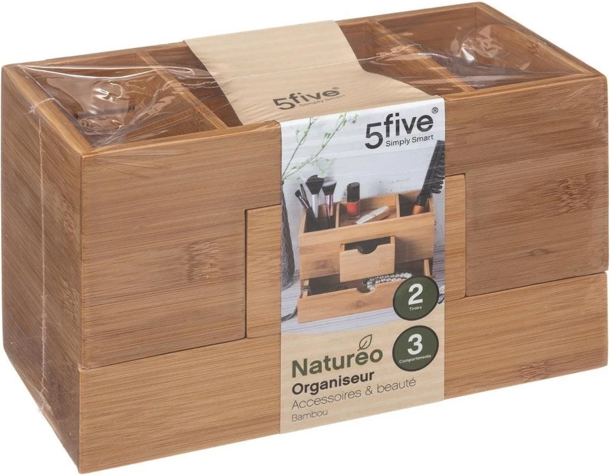 | Verpakkingsinhoud | rganizer met 3 vakken en 2 lades 24 x 14,5 cm van bamboe – Sieradenkastje – Make-upkastje – Organizers |